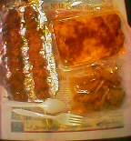このラザニアが屋台で売られていた。1切れ$3。それと焼き鳥1本$1を2本と