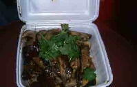 甘いタレとクレソンの強烈な香り。アジアの味である。骨から上手く肉が離れなくて、非常に食べにく