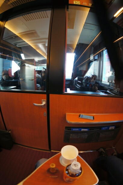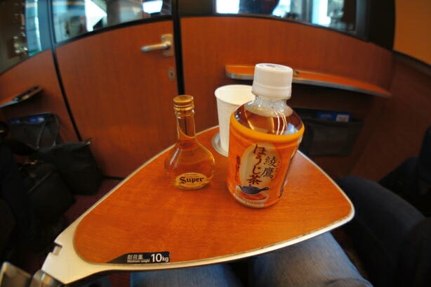 上りだと、この席で展望席に。周囲は顔色悪いサラリーマンだらけ。悪いけど、ウイスキー