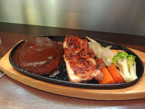 デキャンタのワインは400ml、ハンバーグとチキングリルはジューシーでお手頃価格。
