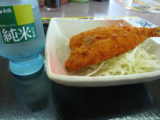 まずは絶対に「パンチ(モツ煮込み)」です。お次は鯵フライ、そして純米酒は330円也