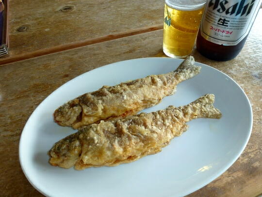 見栄えの無い鱒の唐揚げ。せめて、キャベツを敷くとか、波打って串打ちするとか、こ