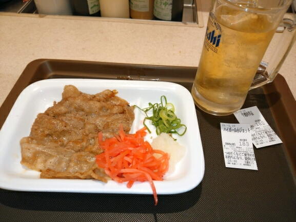 バスで最寄りの駅に。松屋で一杯です。これで550円也。さすがファストフード店です。