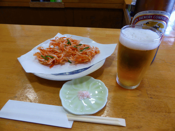 駅の真ん前にある「食事処・あおぞら」で念願のかき揚げとビールです。