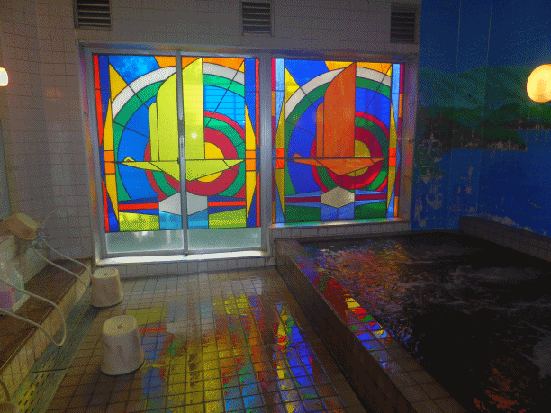 このステンドグラス良い雰囲気ですよ。ヨーロッパの温泉に浸かっている気分。