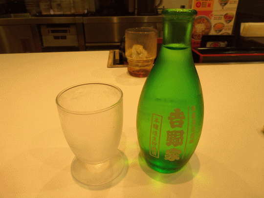 吉野家の冷酒はいけますよ。ピンと透き通った香りの良い地酒の様です。サラダと牛