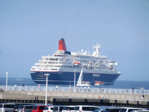 答えは、沖に「にっぽん丸」が停泊していました。そこからハシケ船で次々に乗客(ツア