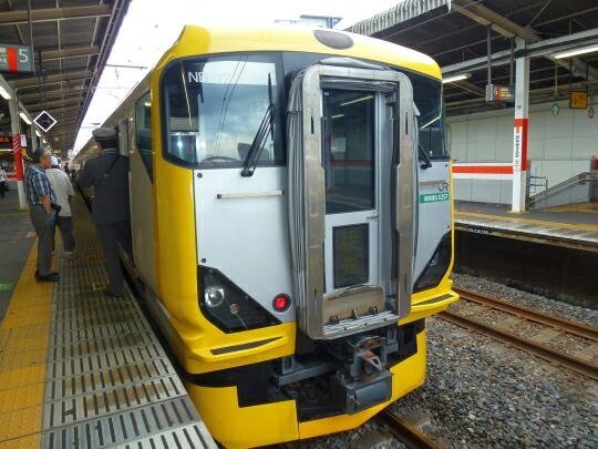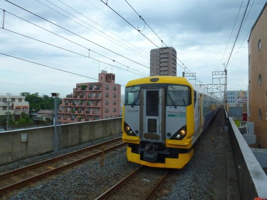 入線してきた車両は黄色い「E257形500番台」だった。主に千葉県内でよく見る特急車両だ。