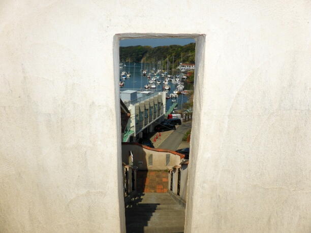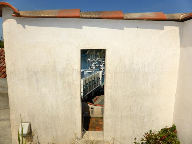 油壷湾を見下ろす「西海岸線」という道路脇で発見した民家の壁。細長く四角い穴が開いてい