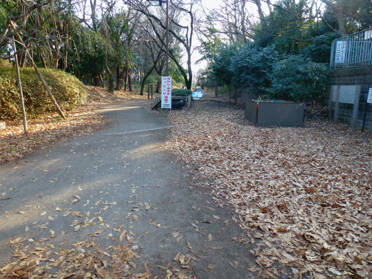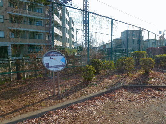 く。まさしく、この駐輪場こそ遊歩道上にあった。そして、公園の線路際に例の看板を発見する。