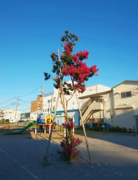まずは直近に撮った木。撮影日は21/08/1。毎年、夏の真っ盛りに赤い花が咲きます。植